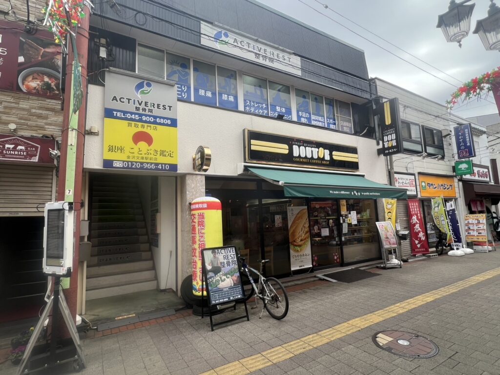 左手にドトールコーヒーさんが見えてきます。その2階がアクティブレスト整骨院です。